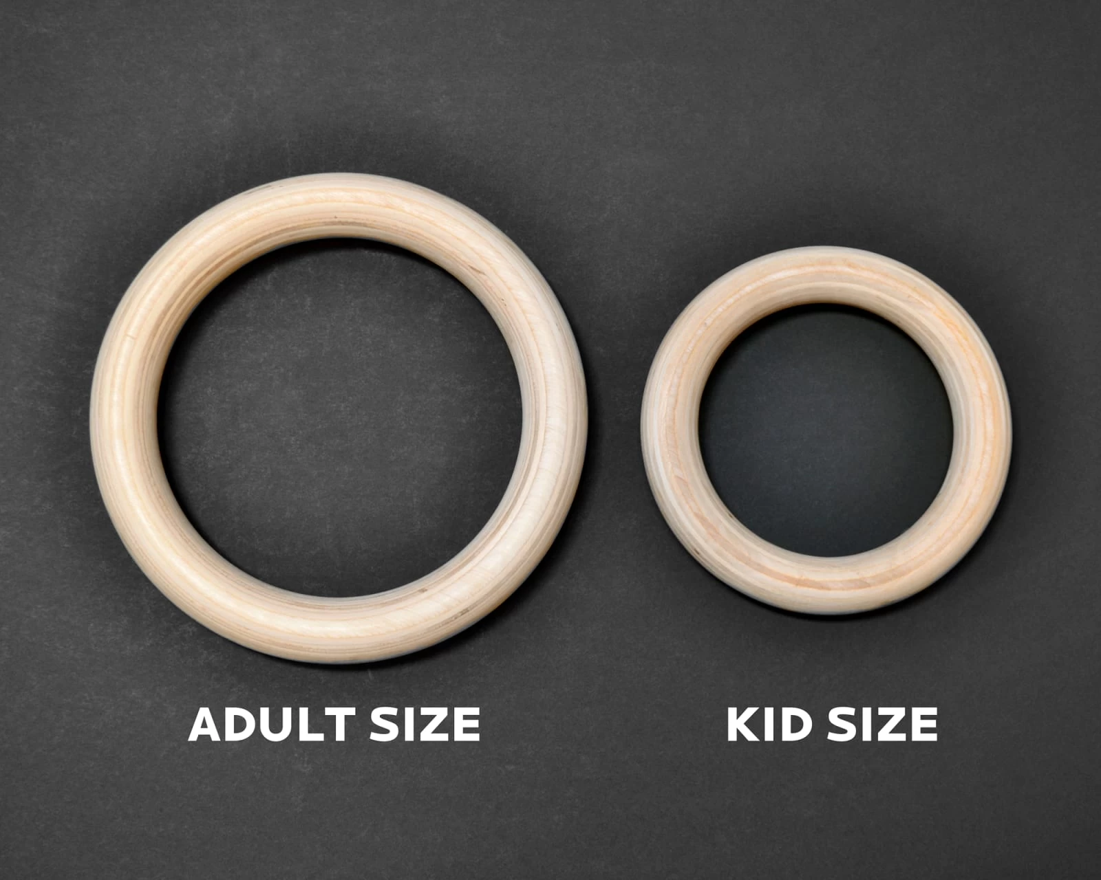 Gymnastics can be one of the best tools for child athletic and personal development. Now, there is an answer to the 1.25″ diameter standard ring set. The Kids’ Wooden Rings have a 1.10″ diameter thickness with a proportionately scaled ring diameter. This allows for the perfect grip and positioning for smaller hands. The components used for the Rogue Kids’ Rings are manufactured and assembled with our usual highest standard in mind. Assuring that, both, the young athletes and their rings will continue to thrive under pressure.