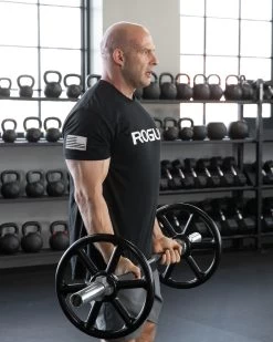 The MG-4F’s friction welded sleeves, which are available with 9” of loadable length or 15.5” of loadable length, use the same internal components as our standard barbells and rotate on shafts made from the same stainless steel as our power bars. The distance between the sleeves is also the standard 51.5”, making the bar rackable on any Rogue power rack, squat stand, rig, or bench.