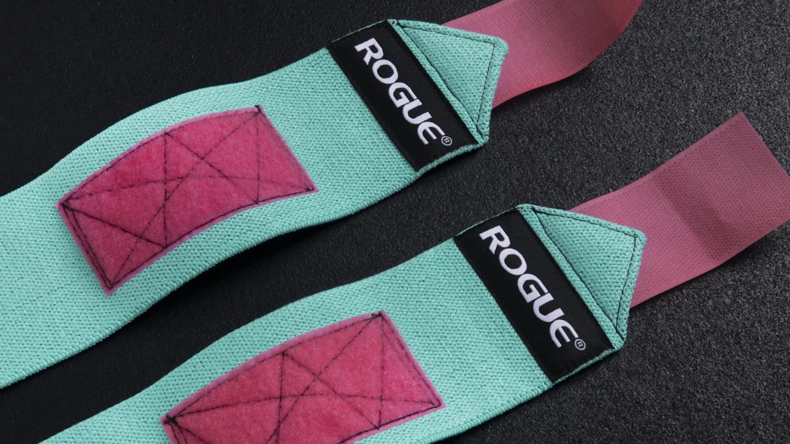 This standard Rogue Wrist Wrap model comes in Aqua / Pink and the Rogue logo in white. It includes a convenient thumb loop and hook-and-loop closure for a secure fit, easy adjustments, and quick removal.